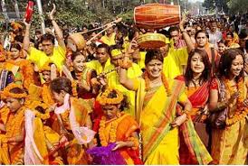 Spring is called the king of seasons. The climate at this time is very pleasant and inspires people to take morning and evening walks. At this time the sky is clear and plants sprout new leaves. There are balmy breezes from the south, very welcome after the cold winter. Flame-coloured shimul, palash and krisnachuda blossom, as does the golden radhachuda and the mauve jarul. Fruit trees such as mango and jackfruit also flower at this time .